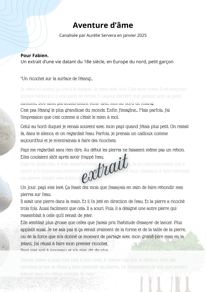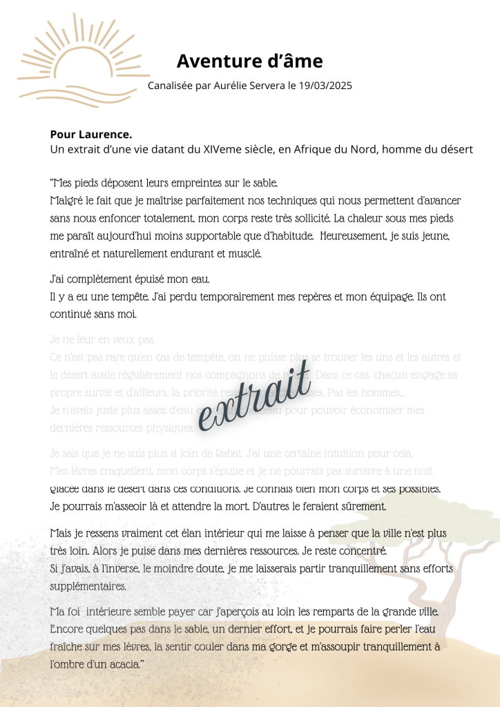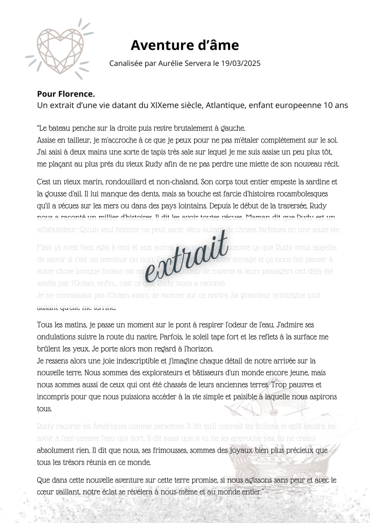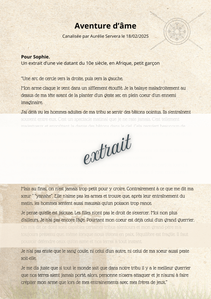 Les aventures et histoires d’âme sont des extraits de vie antérieures que je canalise pour vous et retranscrit de manière romancée.